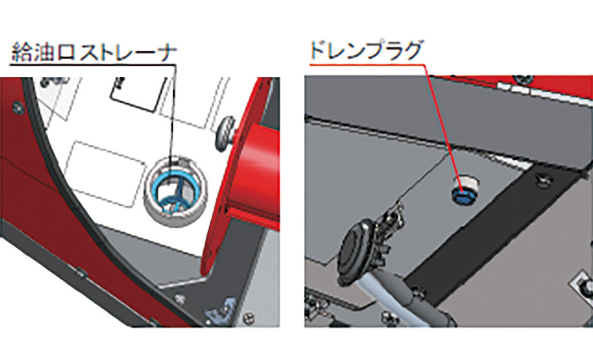 ●100時間毎に給油口ストレーナより、ゴミを抜き取り、タンク下部のドレンを外して、タンク内の水・ゴミを抜き取ります。